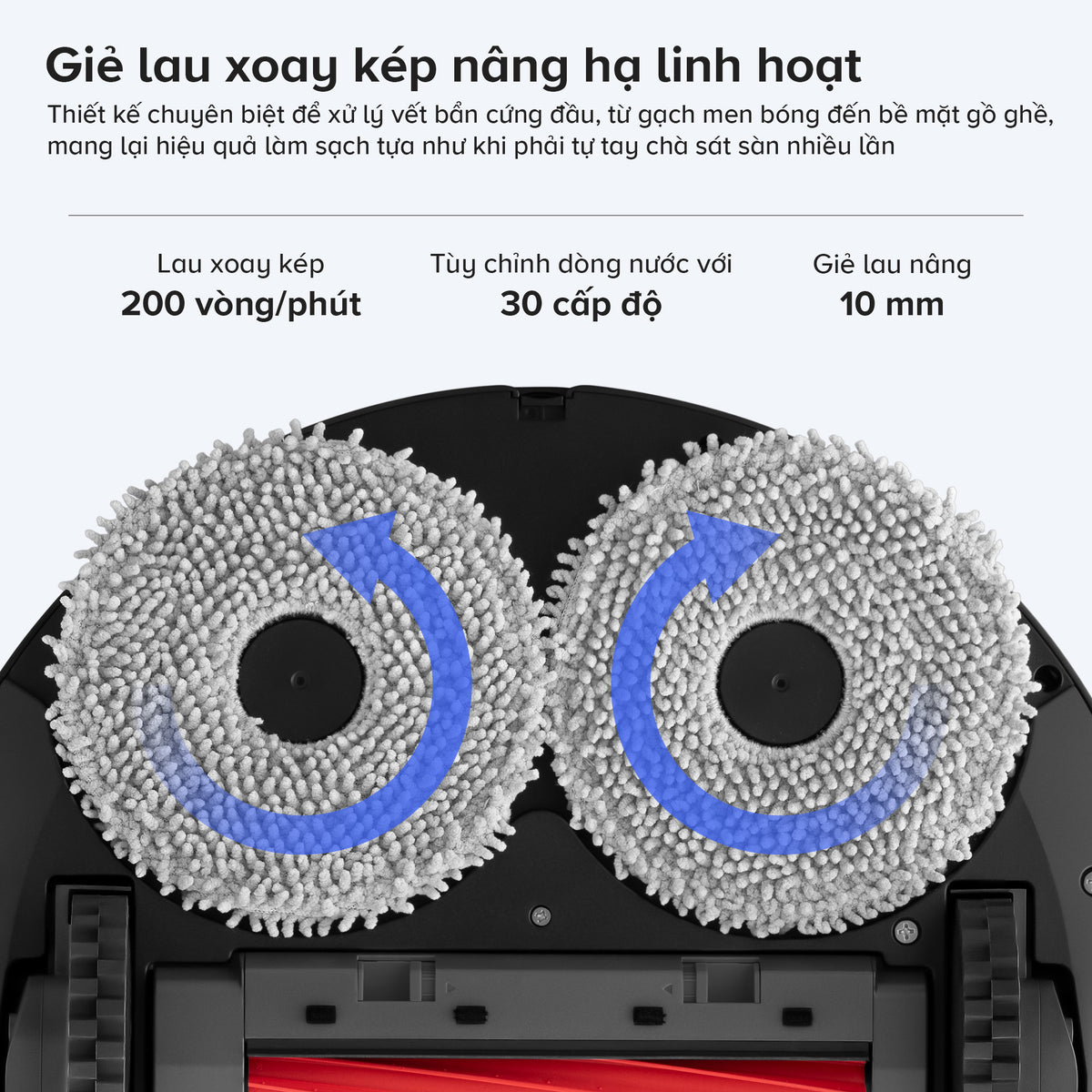 Giẻ lau tự động nâng lên khi robot quay về dock sạc, trong quá trình giặt hoặc tiếp lục lau sau khi giặt. Khi sạc, giẻ cũng sẽ được nâng để giữ thông thoáng, ngăn ngừa nấm mốc và mùi hôi